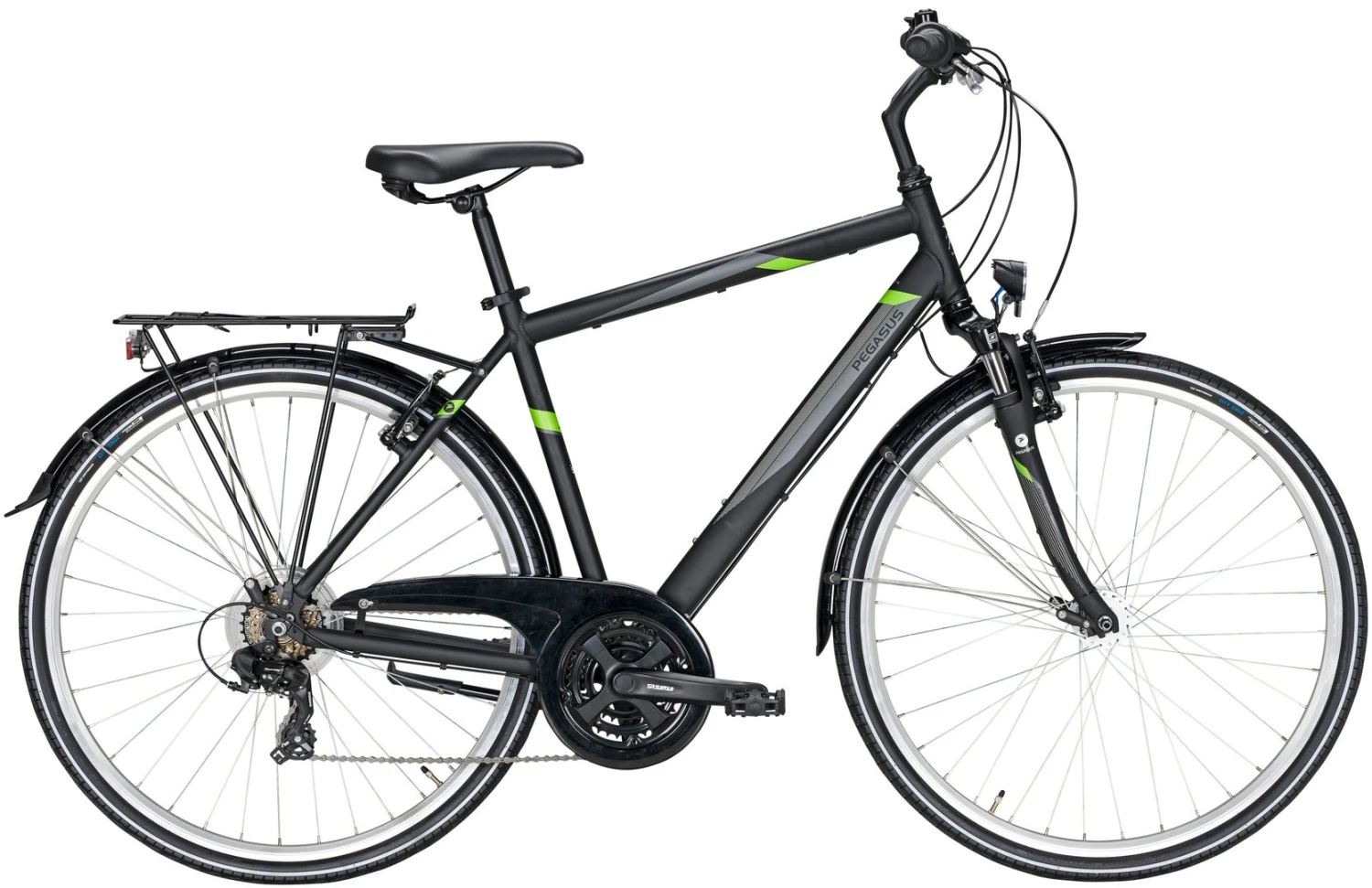 Alu Rahmen, Suntour CR-100 Federgabel, Shimano Tourney 18-Gang Schaltwerk, Umwerfer und Revoshift Schalthebel (Drehgriffe), Suntour Kurbeln mit gekapseltem Lager, Alu V-Bremsen, Hohlkammer-Felgen, Nabendynamo, 30 Lux LED-Lampe, Standrücklicht, Kettenschutz